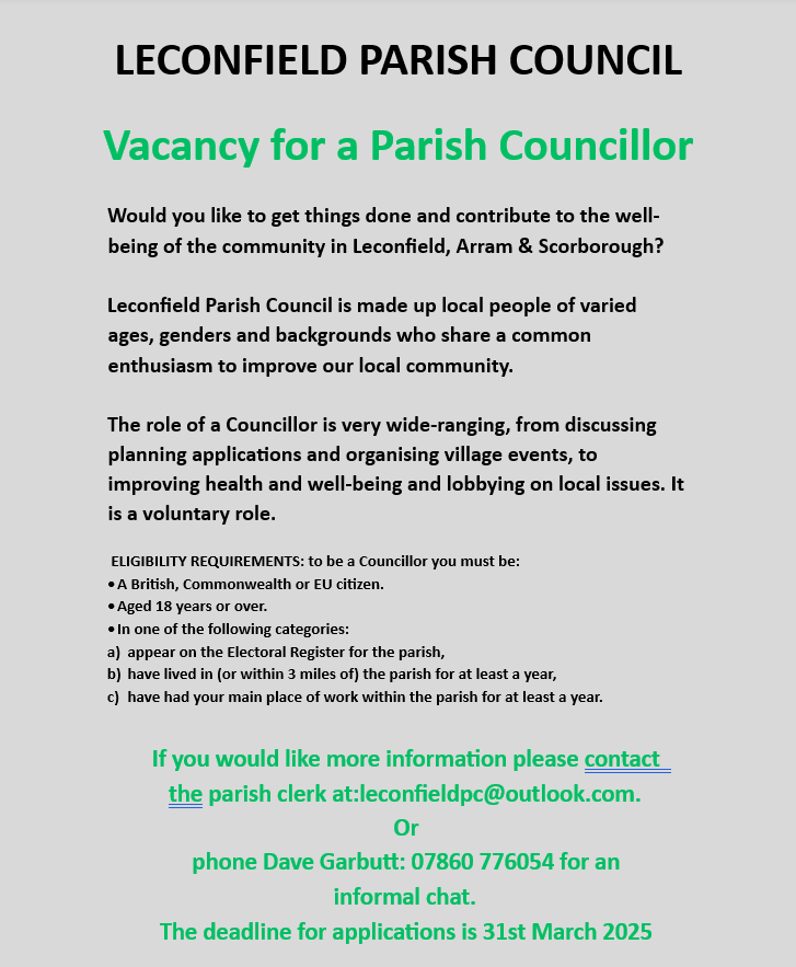 Opportunity to join the Leconfield Parish Council Posted bydavegarbutt535cfc8157March 2, 2025Posted inNews Share this: Click to share on X (Opens in new window) X Click to share on Facebook (Opens in new window) Facebook Like Loading... Related
