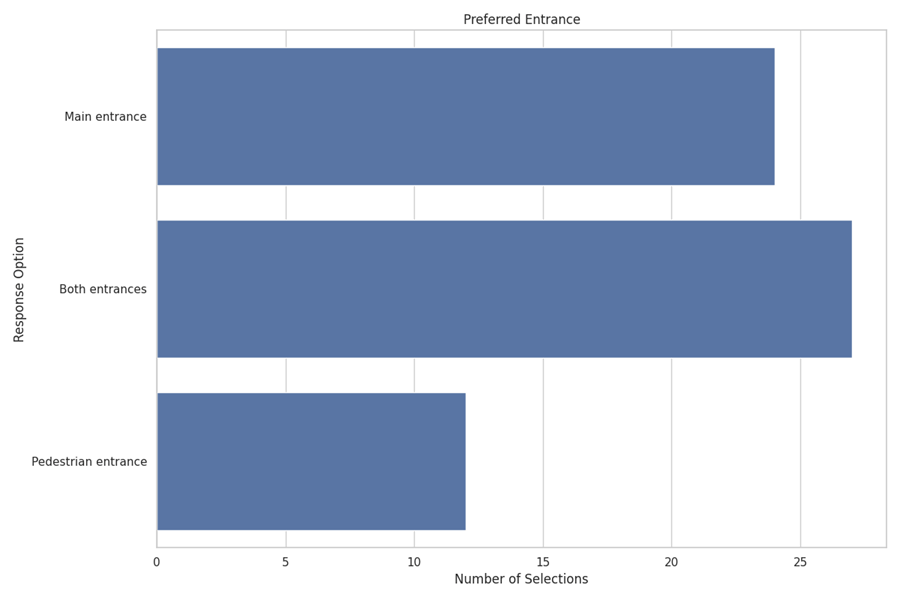 Total respondents: 64. Multiple selections were allowed. Most selected option: ‘Both entrances’ with 27 selections.