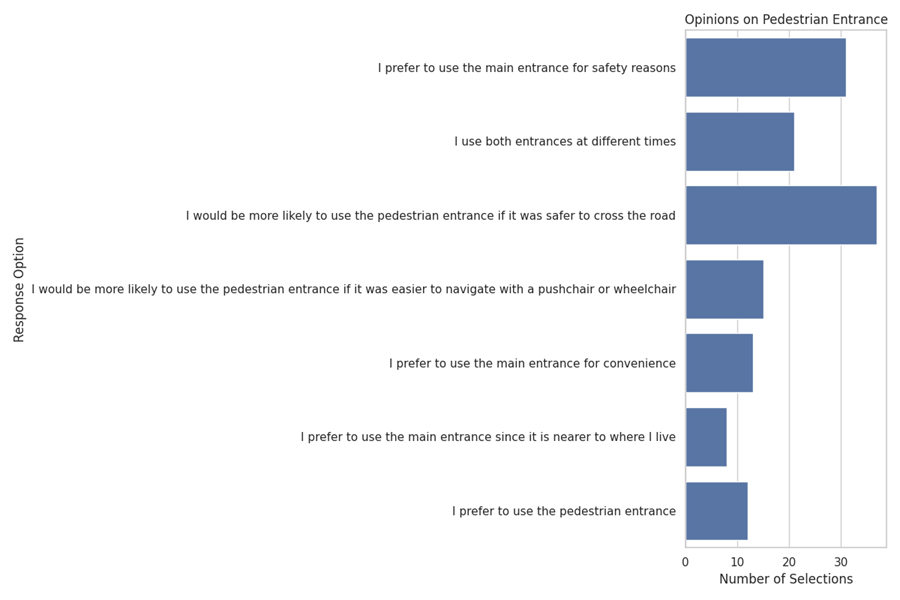 Total respondents: 64. Multiple selections were allowed. Most selected option: ‘I would be more likely to use the pedestrian entrance if it was safer to cross the road’ with 37 selections.