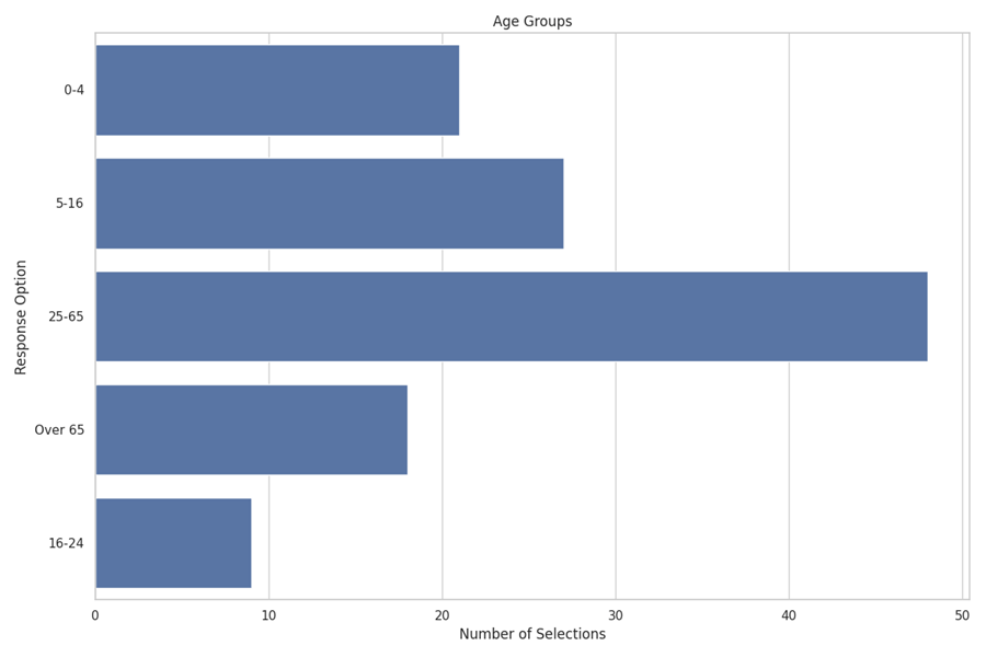 Total respondents: 64. Multiple selections were allowed. Most selected option: ’25-65′ with 48 selections.