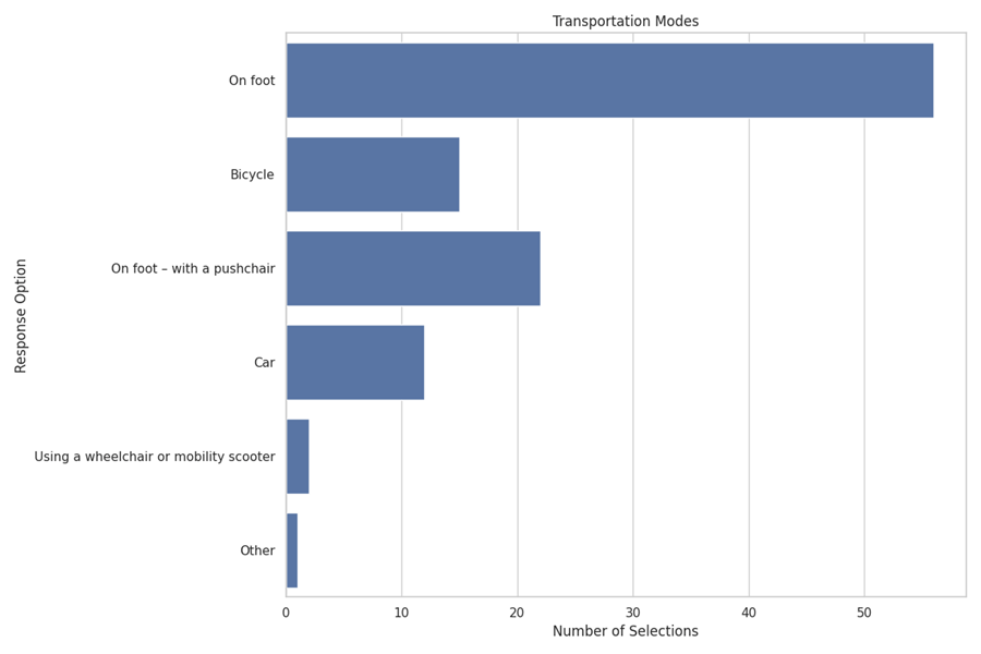 Total respondents: 64. Multiple selections were allowed. Most selected option: ‘On foot’ with 56 selections.
